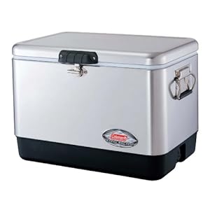 The Coleman Steel-Belted Cooler combines the classic, world-famous Coleman design with the long-lasting strength and durability of stainless steel construction. The 54-Quart Cooler holds 85 cans. It features a solid-steel latch to securely protect and seal the contents, and stainless-steel handles with rubber grips so it-Inchs comfortably to carry. A built-in rustproof, leak-resistant channel drain provides easy, no-tilt draining. Rust-resistant hinges and screws protect against corrosion and breakage, while the base, lid and liner are easy to clean.